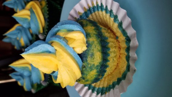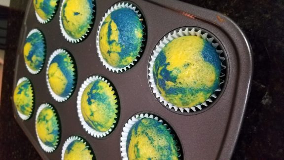I made marble cupcakes with blue and yellow batter AND blue and yellow buttercream frosting, but you can go for one or the other if you want a more sophisticated look. You can also adapt the recipe to use a mix of chocolate and vanilla flavors or any combination of two colors.